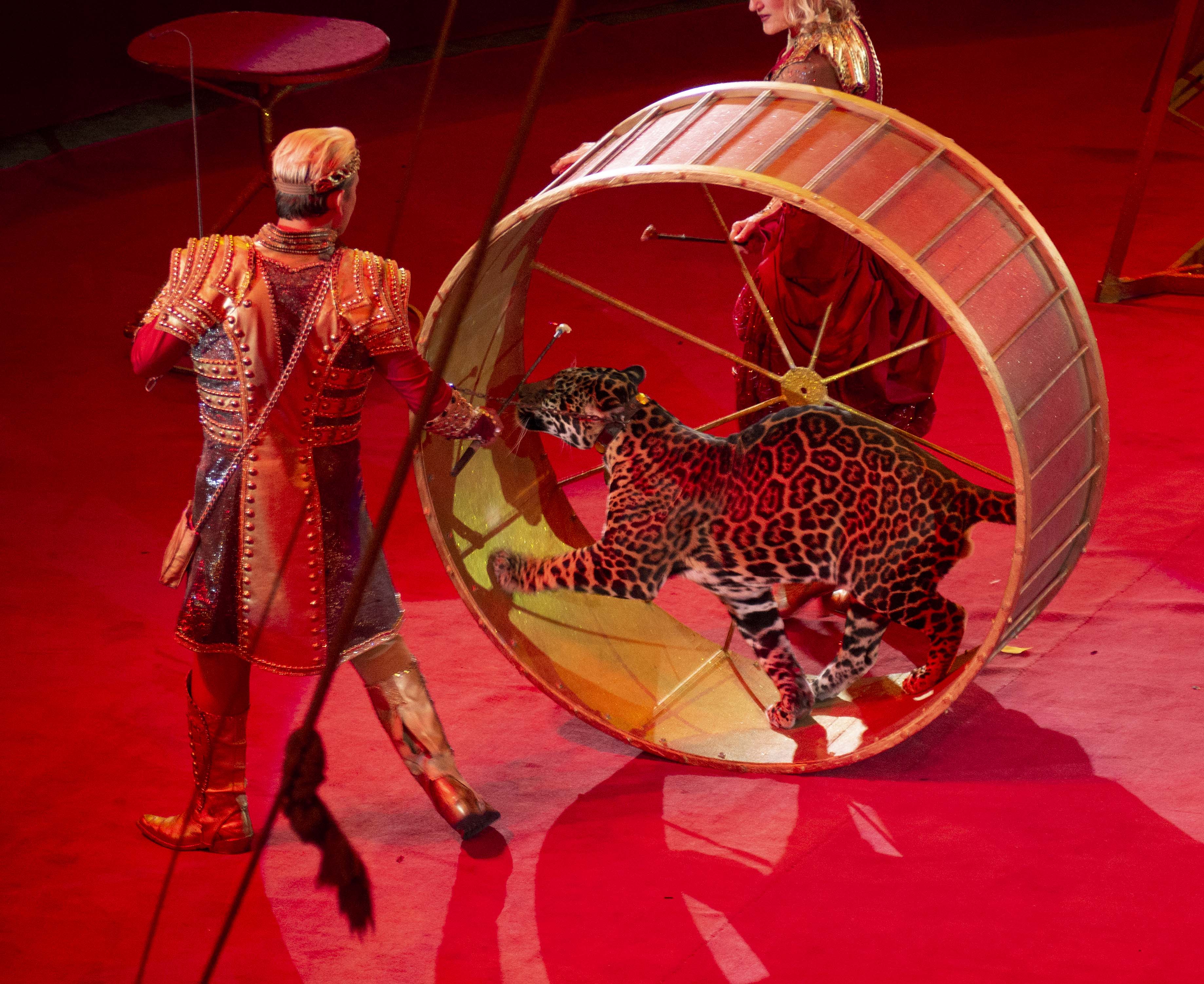 - The big cats were clearly very hungry as they begrudgingly cooperated with humiliating tasks like treading in a giant hamster wheel or jumping through fire in order to receive their rewards of raw meat on skewers.