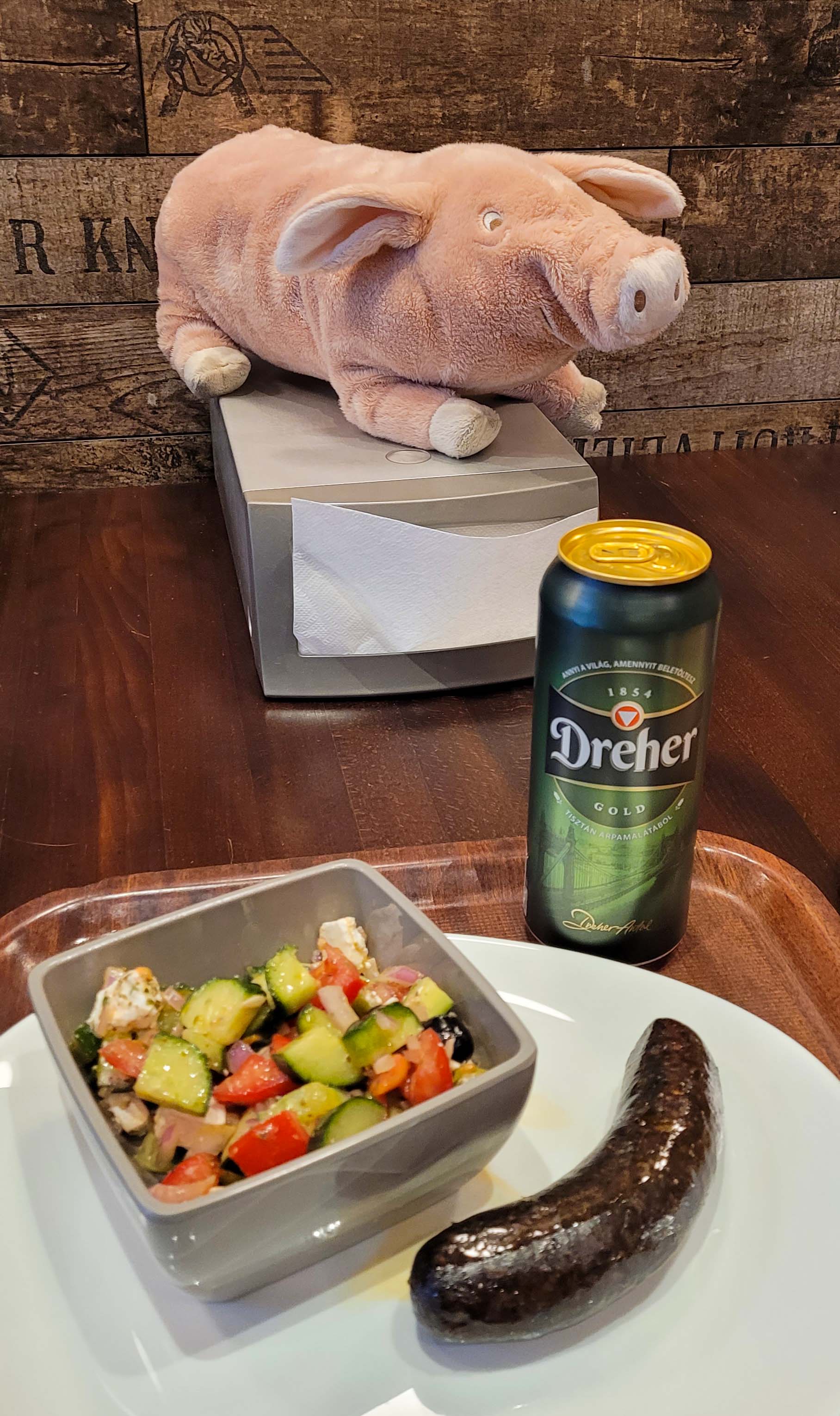 I had been dreaming of all the hearty traditional dishes I would be eating every evening and so purposely reserved a hotel in the touristic centre (Pest side). The reality, however, wasn’t quite what I had imagined. Cafes and diners closed quite early (around 6pm) which left only pubs and fancy international types of restaurants open after dark for wining and dining. On a couple of occasions I did try these tourist-trap restaurants and was ushered both times into a tight and uncomfortable table for one. I could almost see the visible disappointment on the hosts’ faces at losing another potential cover on a two-person table. This led to me thinking of alternative options for my evening meals; one being a picnic from the Spar supermarket (consisting of a beer, a kifli crescent roll, cheese of some sorts, German cured ham, crisps (paprika flavour of course) and Túró Rudi (a chocolate-covered curd bar). As luck should have it, next to my hotel was a good butchery decorated with plush pigs on every table that sold ready-to-eat black pudding (hurka). And on my last night, I resorted to a Zing Burger and didn’t regret it. This Hungarian high street chain is nothing like McDonald’s, offering a high quality menu for a low price.